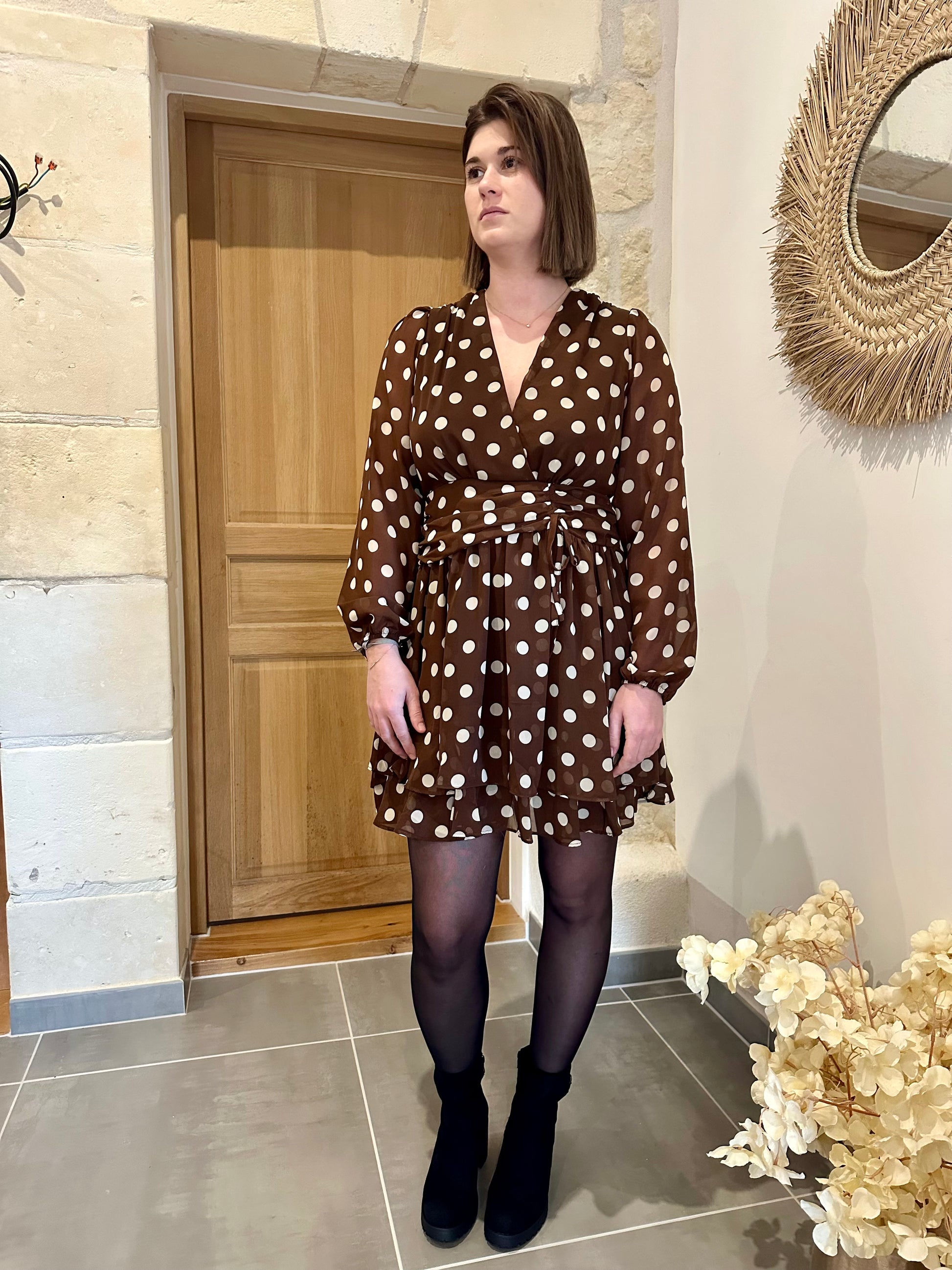 Robe à pois chocolat et beige, resserrée à la taille, volants.